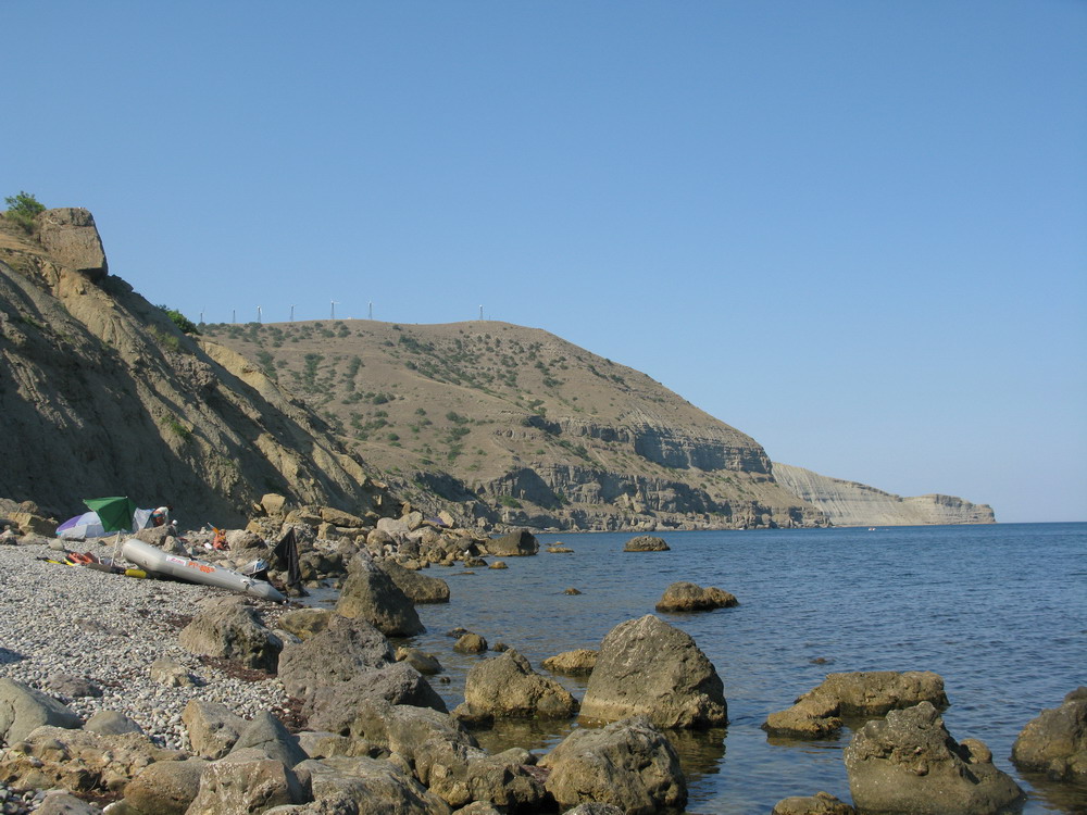 Трудная дорога на машине и пешком наградила нам чудесным видом, незамутненной водой, красивым дном и рыбками, малым количеством народа. Самое лучшее место для купания, что мы видели в Крыму. Дно в разломах и пещерах, камушки, растения, крабы и рыбы. Лучше чем в Турции и не настолько много хуже чем на Красном море. Плавать с маской там действительно интересно. Некоторые там подводной охотой промышляли.